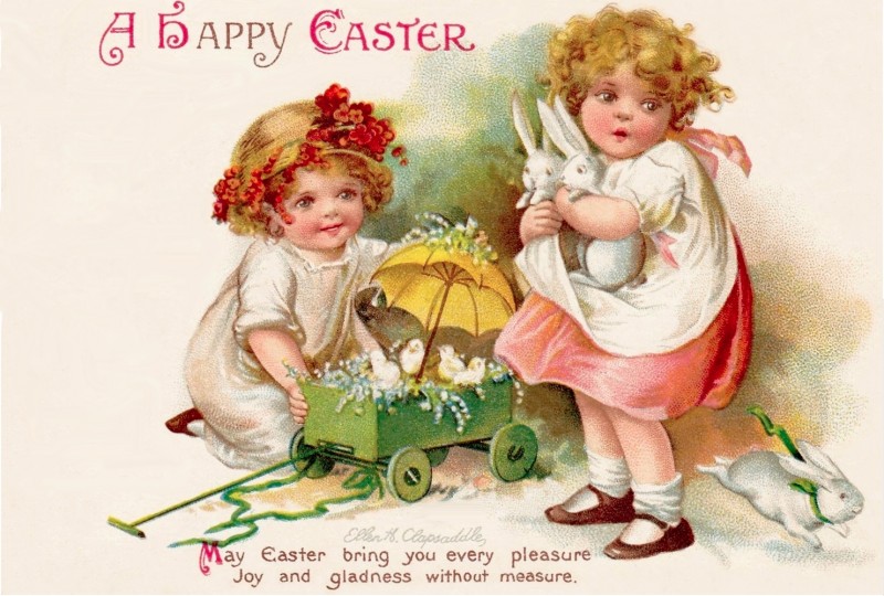 A Happy Easter vintage postcard from the wonderful artist Ellen H. Clapsaddle. Her work is so charming. Like so many of the postcards she illustrated, this one features two young children. Along with the two curly-headed little girls, there is also a quartet of yellow chicks in a green wagon. One girl is holding a pair of white rabbits but is watching as a third bunny scampers away.